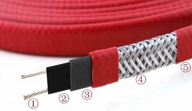 1、銅芯導(dǎo)線 2、導(dǎo)電塑料層 3、聚烯烴絕緣層 4、鍍錫銅絲屏蔽層 5、氟塑料護(hù)套